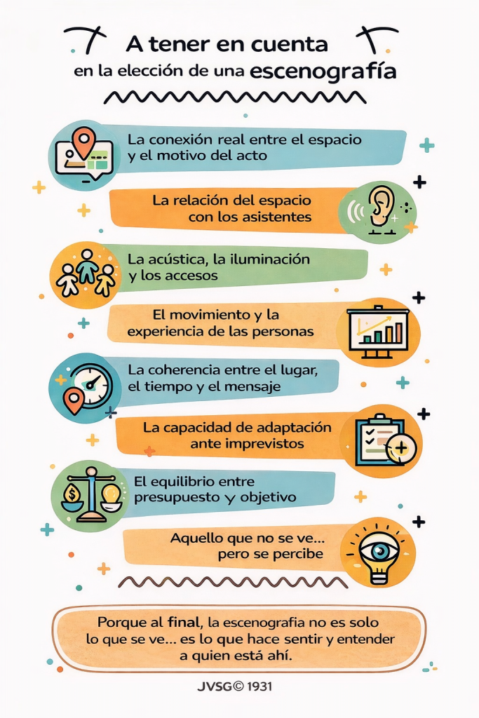 Es importantísimo sensibilizar a las personas de que la escenografía no puede convertirse en un simple envoltorio, donde prime más lo estético o el interés particular de querer contentar a unos por diversos motivos. La escenografía se escoge muchas veces por razones que son la antítesis del uso de ese espacio. Por ejemplo, en la política sucede en muchas ocasiones, o en el deporte… importan más otros factores que desconocen el verdadero motivo de la elección de ese espacio —lugar, tiempo y finalidad—.